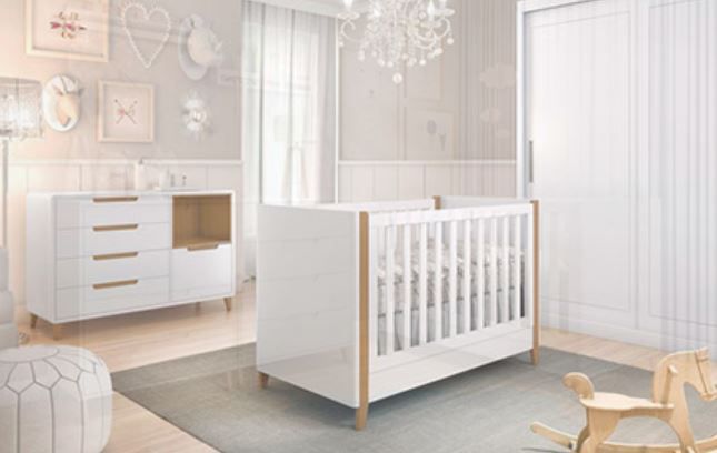 Berço Capri Branco com madeira: berço padrão americano, com pé em madeira maciça tingida na tonalidade Mel, que emoldura as cabeceiras do produto, proporcionando o design clean e moderno. Transforma em mini cama.
