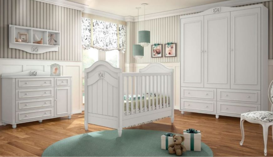 Berço Paris: Linha robusta, com design provençal que pode ser usada para quartos infantis e juvenis. O aplique em laço é opcional, podendo a linha ser utilizada para quartos de meninas ou meninos.